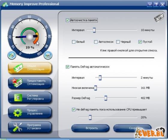 Memory Improve Professional – это один из полезных инструментов, который в информативной форме в виде прибора показывает текущее состояние потребления памяти и может автоматически или вручную производить дефрагментацию и освобождать для вас ресурсы в виде дополнительной памяти. Это в целом улучшит работу системы, уменьшит время её загрузки и повысит её производительность.