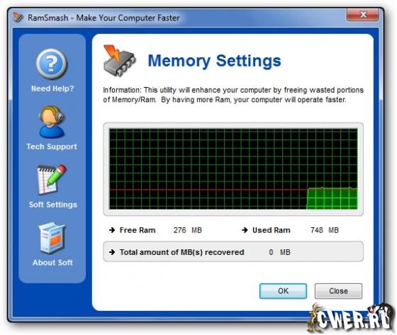 RamSmash - оптимизатор и менеджер памяти, способный ускорять работу операционной системы, освобождая и оптимизирую занятую приложениями память компьютера. Программа может работать в полностью автоматическом режиме, производя оптимизацию через установленный промежуток времени.