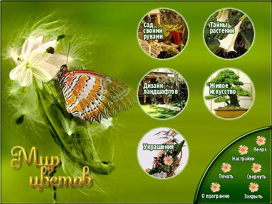 Энциклопедия рассказывает об удивительном и прекрасном мире цветов и состоит из пяти основных разделов: — Сад своими руками; — Тайны растений; — Дизайн ландшафтов; — Живое искусство; — Украшения из цветов. Масса подразделов, содержащих полезною информацию о выращивании цветов, о видах садовых и комнатных растений, искусстве бонсаи, икэбаны, составление букетов и композиций, о ландшафтном дизайне, о лекарственных и ядовитых растениях и многом другом.