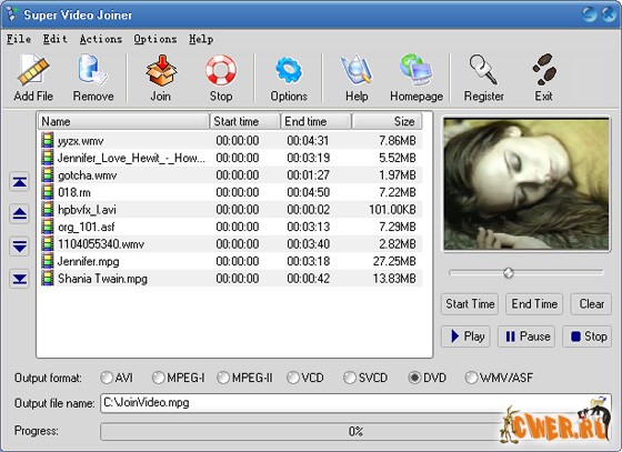 Программа для соединения неограниченного количества видеофайлов в один большой. Имеется поддержка AVI-, DivX-, MPEG1-, MPEG2-, VOB-, DAT-, WMV-, ASF-форматов. Присутствует возможность конвертации между этими форматами, настройки и выбора кодека, размера, битрейта, числа кадров в секунду и т.д.