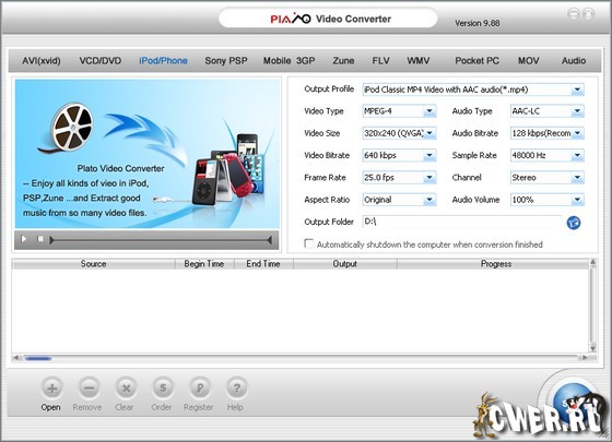 Plato Video To iPod Converter - программа для конвертирования видео в формат iPod, PSP, 3GP для просмотра на iPod, PSP (sony playstation portable), мобильных телефонах, Xbox, КПК, PMP. Способен работать почти со всеми форматами: rm, divx, xvid, avi, wmv, asf, mpg, mpeg, vob, mov, qt, vcd, svcd, Apple iPod MP4, Sony PSP MP4, 3GP, X-box MPEG2, PMP, PDA, SD Video ASF, AVI, MPG, MPEG, ASF, MOV, AMR, FLV, FLIC, SWF и другие.