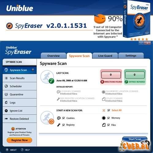 SpyEraser - программа, которая помогает обнаружить и устранить шпионские модули на компьютере. Выполняет быстрое сканирование и безопасно удаляет все найденные объекты.