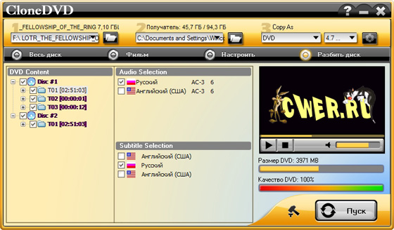 CloneDVD - программа предназначена для создания полностью идентичных копий DVD-фильмов и их записи на DVD-носители. Программа может полностью переписать содержимое диска, что позволяет создавать копии в режиме 1:1 (со всеми меню, субтитрами и т.д.). CloneDVD поддерживает работу с большинством существующих приводов, обладает хорошим быстродействием и качеством записи. Имеется русский интерфейс.