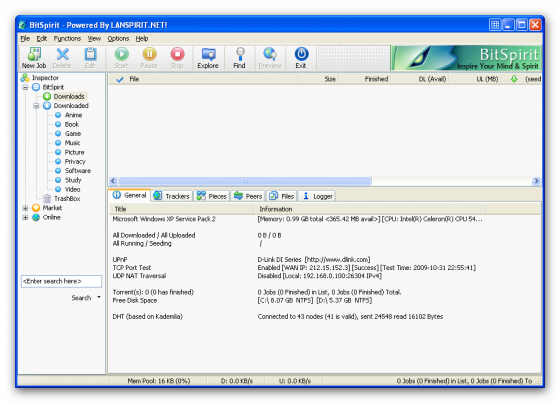 BitSpirit - мощный и удобный в использовании клиент BitTorrent, который не только работает по этому протоколу, но также имеет ряд дополнительных возможностей.Среди них следует отметить: удобный и понятный интерфейс, возможность работы сразу с несколькими закачками, механизм кеширования данных на диск, быстрое восстановление работы, поддержка выбора файлов, удобный файловый менеджер, поддержка опции обмены сообщениями, компрессия по алгоритму GZip, работа по расписанию, интеграция в IE, поддержка HTTP/SOCKS4/5 Proxy, малая требовательность к ресурсам ПК.
