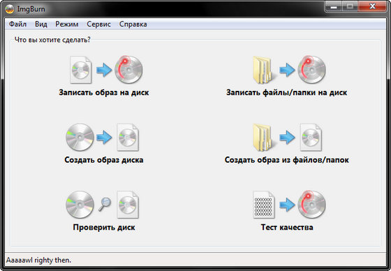 ImgBurn - утилита для записи образов дисков. Эта небольшая программа обладает всеми необходимыми функциями для прожига практически любых образов CD/DVD дисков. В ImgBurn имеются еще ряд других функций, которые позволяют открывать/закрывать лоток привода, осуществлять поиск в Интернет новых версий прошивки для данного устройства записи, изменять метку ISO-образа, блокировать/разблокировать открытие лотка привода. Кроме того, программа умеет очищать диски двумя способами - быстрым и полным. Главной ее особенностью является поддержка большого количества приводов различных производителей. Программа имеет ряд настроек, где можно задать ассоциацию с поддерживаемыми расширениями файлов-образов (BIN, GCM, LST, UDI, CDI, FI, MDS, CDR, IMG, NRG, DVD, ISO, PDI), выбрать интерфейс записи (ASPI, ASAPI, SPTI) и звуковые схемы.