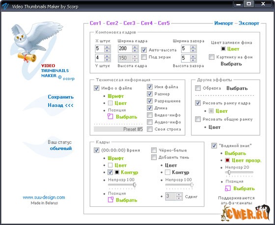 Video Thumbnails Maker - это программа, которая позволяет снимать "превью" с видеофайлов. Утилита имеет широкий диапазон настроек. Поддерживается пакетное снятие превьюшек, раскадровка, водяные знаки, обрезка углов кадров, рамки, тени, альфа-каналы, штамповка времени в кадрах, добавление информации о видео, настраиваемые прозрачность, цвета и шрифты. Поддерживаемые форматы видео? Любые, для которых есть подходящие кодеки (читайте, любые, которые воспроизводятся в BSPlayer-e, Windows Media Player-e, ...). Для работы программы необходим Microsoft .NET 2.0.
