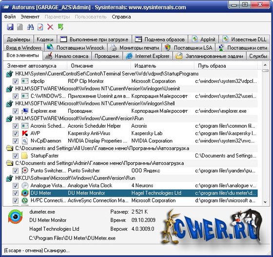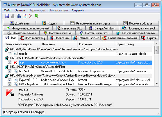 Это средство проверяет большее количество мест, из которых происходит автозапуск программ, чем любой другой монитор автозагрузки. Оно показывает, какие программы настроены на запуск в процессе загрузки или входа в систему, причем эти программы отображаются в том порядке, в каком система Windows обрабатывает их. Такие программы могут находиться в папке автозагрузки или быть прописаны в разделах реестра Run, RunOnce и других. Средство Autoruns можно настроить на отображение и других расположений, таких как расширения оболочки проводника, панели инструментов, объекты модулей поддержки обозревателя, уведомления Winlogon, автоматически запускаемые службы и многие другие. Средство Autoruns обладает более широким спектром возможностей, чем служебная программа MSConfig, которая входит в состав Windows Me и XP.