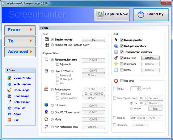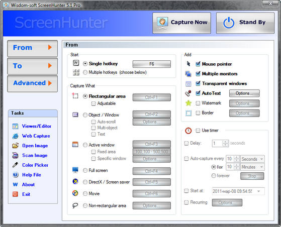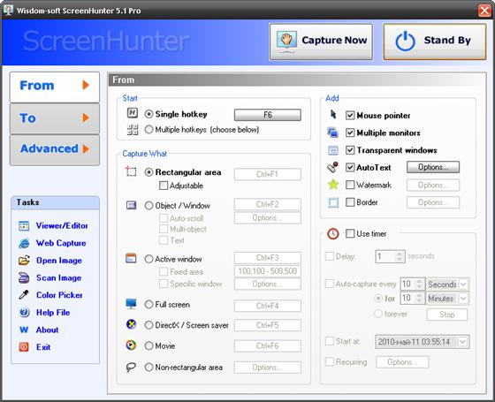 ScreenHunter - программа для получения снимков экрана (скриншотов) с возможностью их обработки и редактирования. Можно получать изображения всего экрана, отдельных окон или заданной области. Есть уникальная функция - получение снимков только определенных объектов в окнах, а также редко встречающаяся функция - захват текста.
