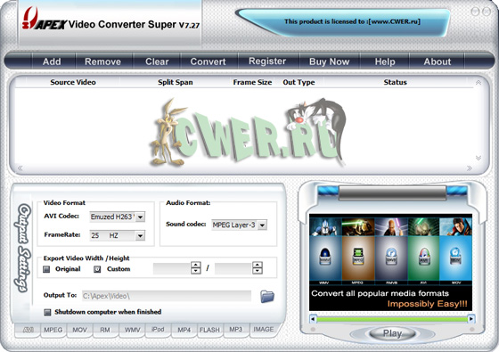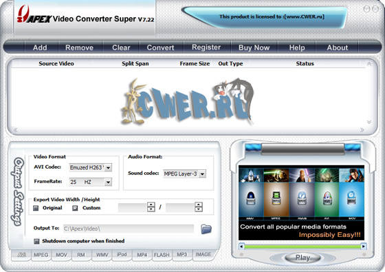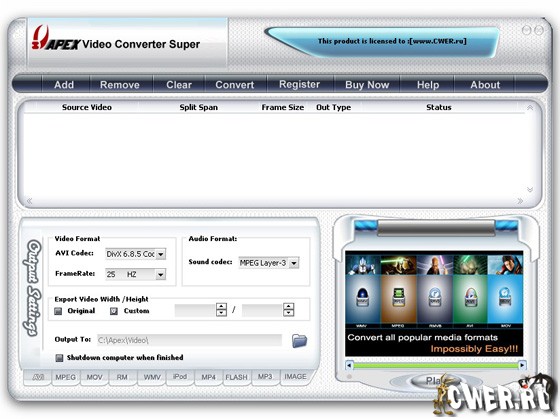 Apex Video Converter Pro - мощный видеоконвертор, позволяющий легко конвертировать видеофайлы из одного формата в другой. Способен конвертировать практически все известные видеоформаты, такие как AVI, DivX, XviD, WMV, ASF, MOV, QuickTime, RM, RMVB, VCD, DVD в MPEG, VCD, DVD, RM, RMVB, WMV, ASF, AVI, DivX, XviD, MOV, QuickTime, Ipod, PSP, Flash SWF, Flash FLV, MP3, WMA. Позволяет конвертировать на высокой скорости без потерь качества, а простой в использовании интерфейс поможет легко конвертировать видеофайлы с функцией предварительного просмотра. Поддерживает видеофайлы большего размера, а также функцию пакетного преобразования.