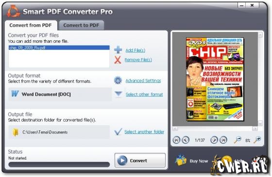 Smart PDF Converter Pro – это простая в использовании и очень полезная программа. Данная программа позволит вам преобразовывать ваши PDF файлы в несколько форматов: HTML, DOC, RTF, XLS, JPEG, TIFF, и TXT. Вы можете конвертировать ваши PDF в отдельные веб страницы или добавлять кнопки к вашим HTML, так что вы можете прокручивать страницы с одной на другую, одним щелчком мыши. Вы можете конвертировать с легкостью редактируемый .doc файл или использовать точный метод, если вам требуется точный слой файла. Вы можете конвертировать отдельный файл или различные таблицы Excel файла.