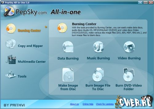 Pepsky All-in-One - набор утилит для записи дисков и конвертации мультимедиа файлов, состоящий из 19 инструментов. Данные инструменты могут использоваться для записи данных, музыки, CD или DVD фильмов, для копирования дисков и конвертации между различными форматами музыкальных и видео файлов. С помощью инструментов Центра Записи вы сможете с легкостью создавать диски с данными, музыкой и фильмами, создавать различные образы дисков в форматах ISO, BIN, MDF, NRG и других, а также записывать образы дисков на пустые дисковые носители. С помощью инструментов копирования вы сможете создавать копии данных с различных дисков, конвертировать аудио диски в мультимедийные форматы и многое другое. Мультимедийный Центр позволяет вам с легкостью конвертировать, разделять и объединять ваши любимые файлы мультимедиа. Также в программе имеются дополнительные инструменты для проверки информации и стирания дисков.