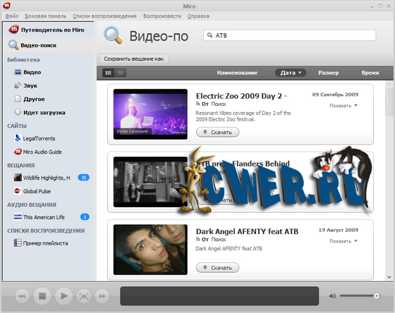 Miro это бесплатный HD-видео проигрыватель, который может воспроизводить почти любой видео файл и предлагает более 6000 бесплатных передач Интернет ТВ и видео подкастов. Множество видеороликов разбиты по тематикам и объединены в плейлисты. Таким образом, Miro представляет из себе интерфейс для первого Web 2.0 телевидения! Среди сотен телеканалов найдутся и спортивные, и новостные, и развлекательные каналы. Не обошлось и без эротики. Но самое главное - имеется великолепная подборка HD-телеканалов! В сети такое предлагает сегодня разве что Joost, и то в меньшем объёме.