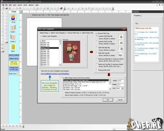 Belltech Greeting Card Designer - является профессиональным программным обеспечением, для разработки дизайна поздравительных открыток. Вы можете добавить свои собственные фотографии, клип-арты, рисунки и многое другое. Возможность добавить цвета и текстуры является уникальной особенностью этого приложения. Вы также можете копировать-вставить тексты и изображения из других приложений. Есть возможность сохранить ваш дизайн и изменить его позже. Можно вставить изображение в формате. JPG,. GIF,. BMP,. PNG,. TIF,. WMF.