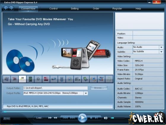 Extra DVD Ripper Express - гибкое и удобное программное обеспечение, позволяющее быстро преобразовать dvd фильмы в avi, DivX, XviD, VCD, SVCD, mpeg, iPod (MP4), iPhone, flv (YouTube), Sony PSP, Sony PS3, WMV, MP4, Pocket PC, 3gp без видимой потери качества. Дополнительно программа может воспроизводит видео во время риппинга. Программа обладает превосходной скоростью работы, выдает на выходе видео файлы отличного качества...