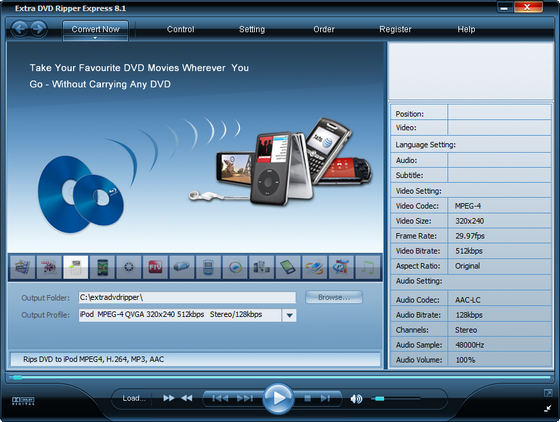 Extra DVD Ripper Express - гибкое и удобное программное обеспечение, позволяющее быстро преобразовать dvd фильмы в avi, DivX, XviD, VCD, SVCD, mpeg, iPod (MP4), iPhone, flv (YouTube), Sony PSP, Sony PS3, WMV, MP4, Pocket PC, 3gp без видимой потери качества. Дополнительно программа может воспроизводит видео во время риппинга. Программа обладает превосходной скоростью работы, выдает на выходе видео файлы отличного качества.
