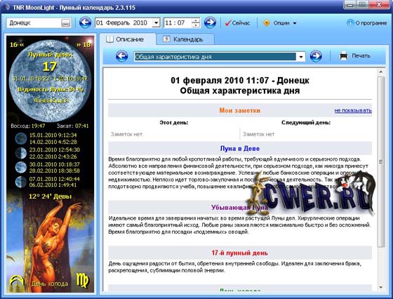 Дает характеристику дня, лунный гороскоп человека, настроение, рекомендации по здоровью, уходу за телом, сельскому хозяйству, дням для бракосочетания. Позволяет производить поиск искомой фазы в пределах 200 лет. Может сворачиваться в значок в системной панели. Есть возможность добавлять заметки на календарные дни.