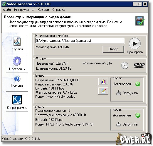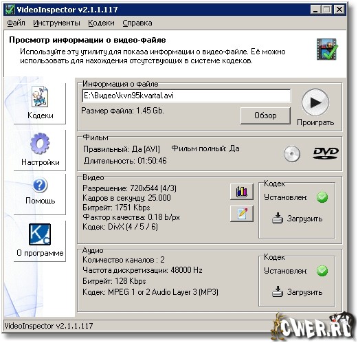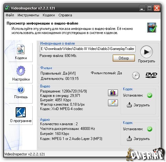 VideoInspector - отображает информацию о видеофайле - сведения о видеокодеке, которым был закодирован файл, об аудиокодеке, видеоразрешении, FPS, BitRate, Qualite Factor и другие. Поддерживаются форматы AVI, Matroska, MPEG I, MPEG II, QuickTime. Кроме этого, VideoInspector имеет еще одну очень полезную опцию, а именно возможность быстрого перехода на веб-страницу для загрузки недостающего кодека.