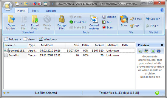 PowerArchiver 2010 содержит все основные функциональные возможности, которые были бы вам необходимы в программе-архиваторе - вы можете просматривать и извлекать файлы большого числа форматов сжатия, также можете создавать архивы в этих форматах, включая 7-Zip, который является одним из лучших форматов сжатия, существующих в настоящий момент. Что выделят PowerArchiver 2009 из огромного числа подобных ему утилит - это богатство дополнительных возможностей программы. Проще говоря, PowerArchiver - одна из наиболее инновационных утилит подобного рода, где впервые были добавлены возможности, которые вы теперь считаете само собой разумеющимся в утилите для архивирования. Они включают новый современный интерфейс - лицензированный Microsoft Office UI, расширения оболочки системы, менеджер паролей, встроенная поддержка шифрования, резервного копирования, преобразования архивов, мульти извлечения архивов, пакетного архивирования, передачу файлов на FTP, мощную поддержку SFX, возможность настраивать внешний вид PowerArchiver с помощью механизма скинов, как и многие другие утилиты. PowerArchiver считается простым, очень мощным средством для создания файлов архивов. Недавно разработанная Профессиональная версия программы добавляет дополнительные возможности: запись CD/DVD/BD, FTP клиент и множество расширенных возможностей резервирования.