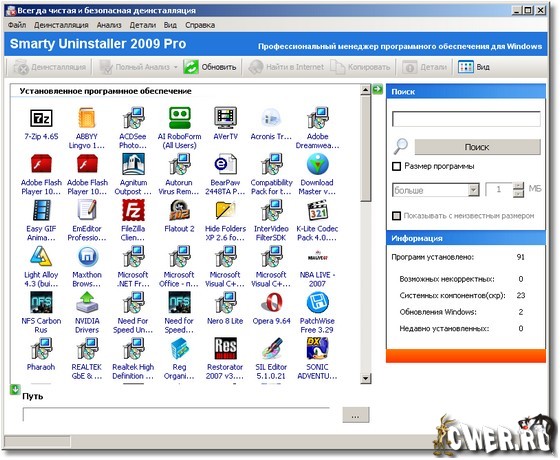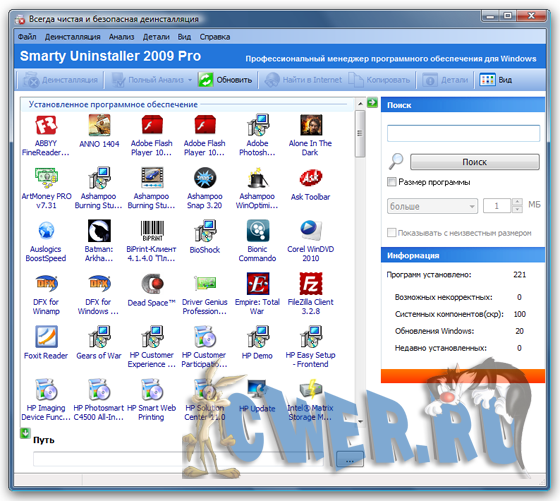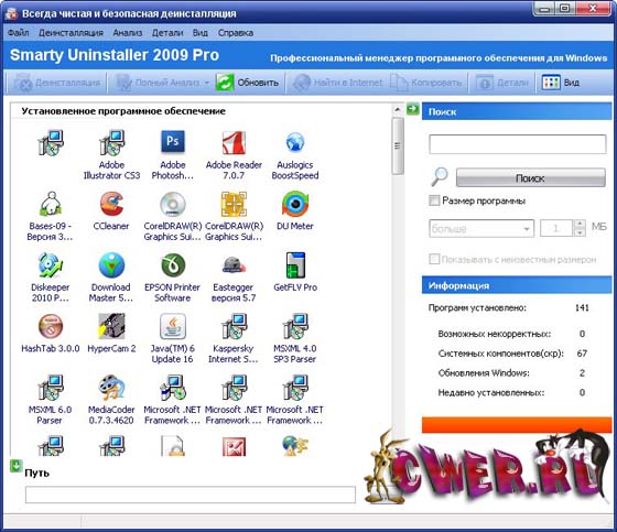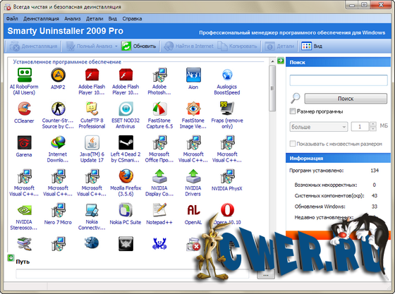 Smarty Uninstaller 2009 - обеспечивает решение задач по деинсталляции приложений, установленных на вашем компьютере. Программа является альтернативой стандартной утилите Windows, при этом имеет ряд преимуществ. Может показывать соответствующие значки приложений, дополнительную информацию о каждой установленной программе, а также есть функция поиска приложения по ключевому слову, автоматическое или ручное обнаружение и удаление неисправных ключей реестра. Smarty Analyzer тщательно просканирует компьютер и удалит файлы, оставшиеся от уже удаленных программ.