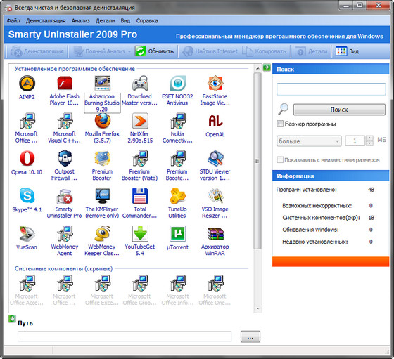Smarty Uninstaller — программное обеспечение , которое позволяет полностью удалить программы (64 и 32 бита) , установленные на вашем компьютере. Он служит заменой стандартному диалогу Добавить/Удалить программу Windows . При этом работает приблизительно в 5-10 раз быстрее стандартного деинсталлятора Windows. Может показывать соответствующие значки приложений. Имеется функция поиска приложения по ключевому слову. Smarty Uninstaller автоматически обнаруживает неисправные ключи реестра и полностью удаляет их по вашему разрешению.