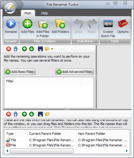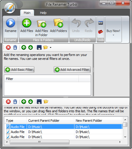 File Renamer Turbo - программа для пакетного переименования файлов. Способна одновременно переименовывать тысячи файлов и папок, а также содержит более 20 специализированных фильтров, значительно упрощающих данный процесс. Также с ее помощью можно редактировать тэги музыкальных файлов MP3, OGG, WMA, M4A, APE, FLAC и MPC. Программа в автоматическом режиме позволяет получать информацию с сайта MusicBrainz.org и заполнять тэги.