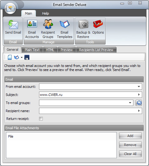 Email Sender Deluxe - лёгкая в использовании программа для массовой рассылки электронной почты и персонализированных новостей. Программа позволяет импортировать информацию как из текстовых файлов, так и из файлов баз данных Oracle, SQL Server, Access, MySQL. В отправления можно вставлять как сами графические изображения так и ссылки на них. В случае неудачной отправки, сообщение автоматически будет отправлено повторно. Используя Email Sender Deluxe, отправка персонализированных новостей и массовой почты вашим клиентам и пользователям становиться простой операцией! Просто выберите своих получателей, напечатайте вашу почту и щелкните по кнопке.