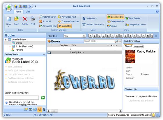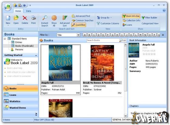 Book Label - программа от компании Codeaero, предназначенная для удобной организации больших собраний электронных книг. Программа автоматически находит информацию о той или иной книге в интернете и записывает ее на жесткий диск, позволяет выполнять сортировку и поиск по базе данных, отмечать книги, которые пользователь дал почитать друзьям (чтобы их не потерять), выполнять печать книжного каталога на принтере, создавать и работать с несколькими базами данных одновременно. Кроме того, программа позволяет настраивать внешний вид, выполнять экспорт книжного каталога в текстовом формате или HTML и вести статистику.