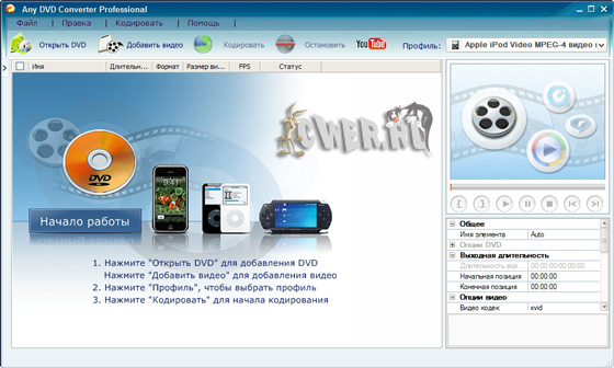 Any DVD Converter Pro – позволяет преобразовывать видео среди форматов AVI, MPEG, WMV, DivX, RM, MOV, 3GP, XviD, VOB и др. Помимо этого, программа обладает функцией риппера, которая позволяет копировать DVD-диски. Кроме того, Any DVD Converter Pro поддерживает пакетное преобразование файлов.