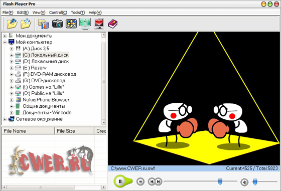 Flash Player Pro - усовершенствованный проигрыватель flash анимации. Помимо просмотра, позволяет сохранять ролики на жесткий диск, делать скриншоты и ставить результат в качестве обоев на десктоп. Плюс ко всему, конвертирует swf и exe между собой.