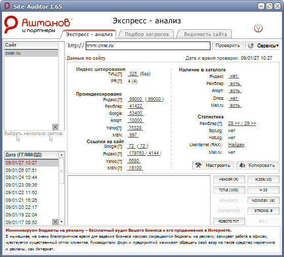 При помощи утилиты Site-Auditor вы сможете быстро собрать данные, необходимые для оценки видимости сайта в поисковых системах Рунета.