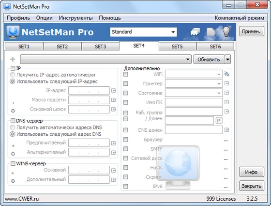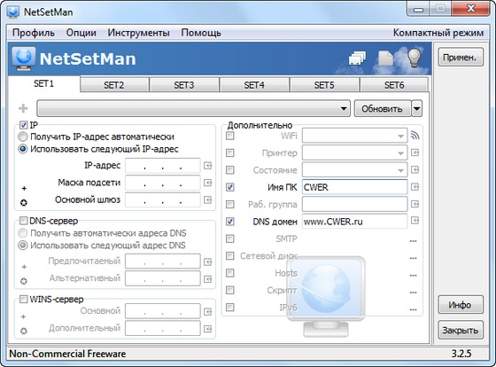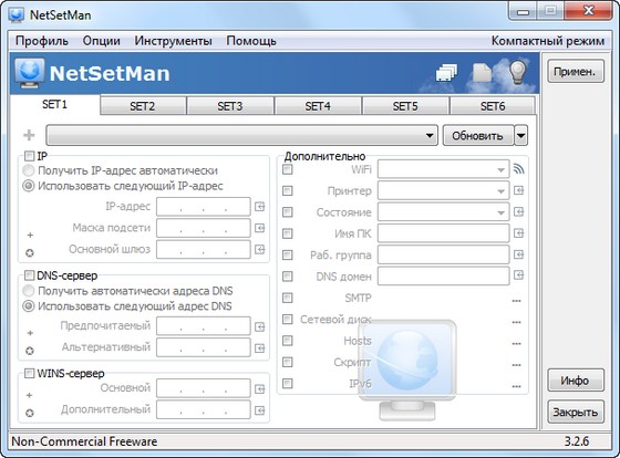 NetSetMan - бесплатная программа, позволяющая быстро переключаться между несколькими заранее настроенными сетевыми конфигурациями.Программа окажется особенно полезной для тех, кто часто переключается с одной сети на другую, ведь каждый раз, когда необходимо подключиться к одной определённой сети, приходится выставлятьть нужные ей настройки.