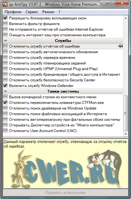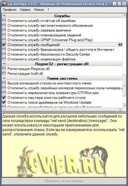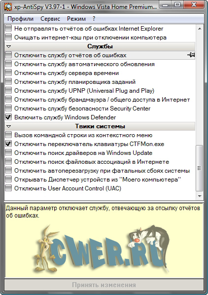 XP-Antispy - небольшая утилита, предназначенная в первую очередь для людей, желающих получить максимально возможный контроль над своим ПК. Программа анализирует конфигурацию установленной Windows XP, Vista и 7 выводит пользователю всю доступную информацию о всевозможных лазейках, оставленных компанией Microsoft, для доступа к его компьютеру. Помимо информационной составляющей, XP-Antispy предоставляет пользователю возможность перекрыть подавляющее число каналов возможных неприятностей. Программа очень легка в освоении и имеет хорошо организованную информативную систему подсказок.
