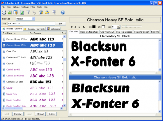 Основной задачей X-Fonter является управление всеми вашими шрифтами, их установка и деинсталляция, загрузка, сравнение, просмотр и пр. X-Fonter поддерживает все типы шрифтов, включая TrueType, OpenType, Postscript Type 1, растровые и векторные шрифты. Вы можете создать свои собственные цветовые схемы и использовать ваш собственный текст для предварительного просмотра. К тому же, этот менеджер шрифтов позволит вам создавать 3D графику, которую вы можете использовать для своих веб-страниц, сообщений электронной почты и многого другого...