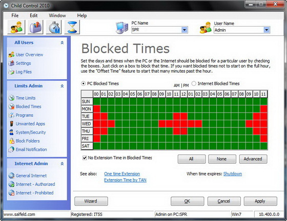 Программа ограничивает время, проводимое вашими детьми за компьютером, как только выделенное им время закончится, компьютер автоматически выключится и повторный вход будет возможен только после ввода пароля. Ограничение можно ввести как по общему времени (например, не более 1 часа в день), так и по периоду времени, когда можно работать (например, с 22:00 до 8:00 доступ запрещен). Кроме этого, программа позволяет запретить посещение нежелательных сайтов, а также заблокировать доступ к определенным дискам и папкам.