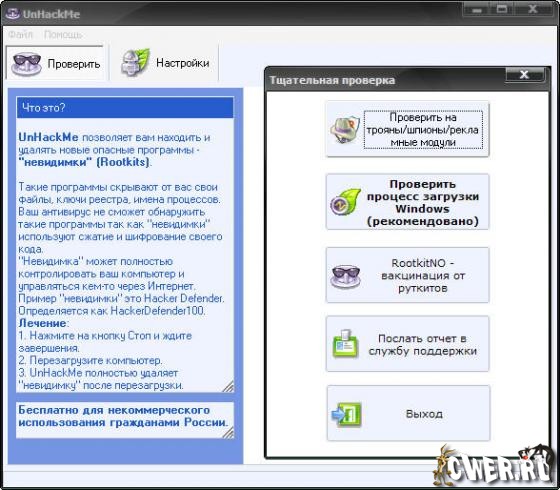 Программа UnHackMe позволяет вам обнаруживать и удалять новое поколение троянских программ - скрытые Трояны. Их называют "rootkits". Rootkit - набор программ, которые хакер использует, чтобы замаскировать вторжение и получить доступ с привилегиями администратора к компьютеру или компьютерной сети.