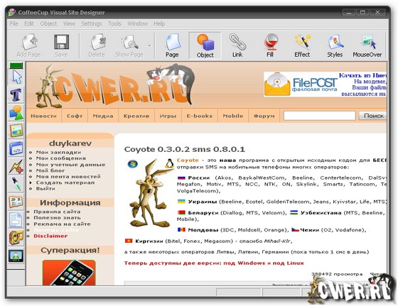 CoffeeCup Visual Site Designer - веб-редактор, позволяющий создавать веб-страницы без знания HTML. Панели инструментов в программе содержат только самое необходимое: вставка текста, изображений, кода, а также графические примитивы. После, того как эти объекты добавлены на страницу, им можно поставить в соответствие гиперссылку или применить к ним визуальный эффект.