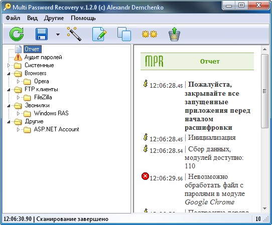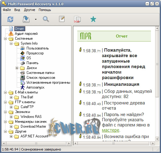 Multi Password Recovery - многофункциональное решение для Windows по расшифровке и тестировании паролей на стойкость. Скачав MPR на cwer.ws, вы сможете автоматически находить и мгновенно расшифровывать пароли из более чем 110 популярных программ (FTP, E-mail клиенты, Интернет пейджеры, Браузеры и пр.), при этом программа не требует вмешательства пользователя. Кроме расшифровки MPR показывает пароли под звездочками, позволяет скопировать SAM файл, удалить сохраненные пароли, сгенерировать новый пароль, сохранить отчеты на жесткий диск.