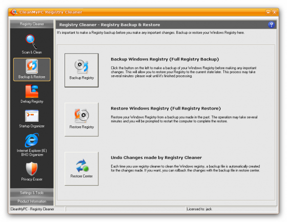 CleanMyPC Registry Cleaner сканирует системный реестр операционных систем Windows на предмет обнаружения и удаления некорректных, поврежденных или неработающих ссылок и записей. Данная процедура позволяет поддерживать работоспособность ОС на достаточно высоком уровне и избегать непредвиденных сбоев в работе ПК. Присутствует опция создания резервных копий реестра, так что вы всегда можете отменить все сделанные изменения и вернуться к наилучшей конфигурации. Также утилита позволяет с легкостью управлять программами и BHO (Browser Helping Object), автоматически загружаемыми в момент запуска Windows и Internet Explorer.