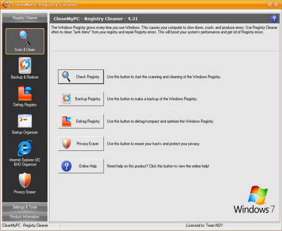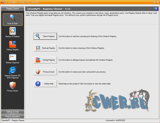CleanMyPC Registry Cleaner - сканирует системный реестр операционных систем Windows на предмет обнаружения и удаления некорректных, поврежденных или неработающих ссылок и записей. Данная процедура позволяет поддерживать работоспособность ОС на достаточно высоком уровне и избегать непредвиденных сбоев в работе ПК. Присутствует опция создания резервных копий реестра, так что вы всегда можете отменить все сделанные изменения и вернуться к наилучшей конфигурации. Также утилита позволяет с легкостью управлять программами и BHO (Browser Helping Object), автоматически загружаемыми в момент запуска Windows и Internet Explorer.