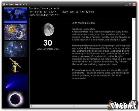 Johannes Kepleris - программное обеспечение для астрологов и астрономов. Программа предоставляет высокую эфемериду точности и превосходный планетарий. Kepleris обеспечивает реальную модель местного неба, которое включает все необходимые объекты - Солнце, Луна, Ртуть... Плутон, 3141 звезда, 1598 астероидов и 101 комета. Весьма легко наблюдать их и получить любую интересную карту или данные. Карта зведного неба показывает все созвездия, их полные числа, границы и названия.