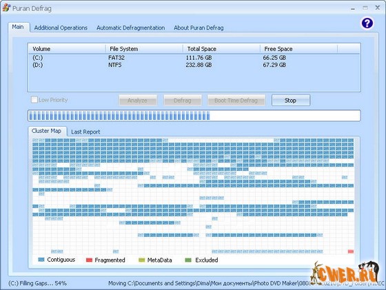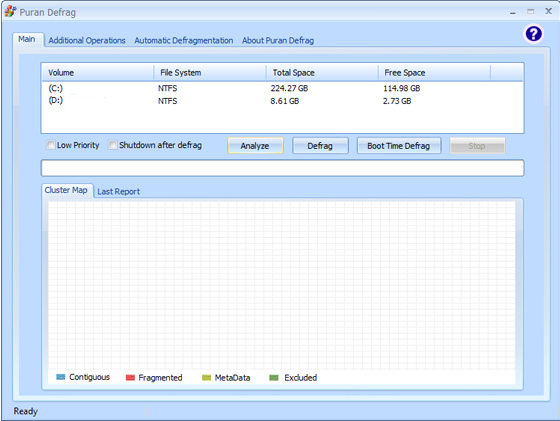 Puran Defrag - это высокоскоростной дефрагментатор, обладающий необычайно простым и удобным интерфейсом, а также некоторыми необычными функциями. Необычность включает в себя не только непривычно удобный интерфейс, но и сама технология дефрагментации, которая заключается, как в полной дефрагментации дисков, или отдельных ее файлов из простого контекстного меню, так и размещение часто употребляемых файлов в область более быстрого доступа, что как и понятно, существенно увеличивает производительность. Даже если для полной дефрагментации файла не хватает места, программа использует все имеющиеся ресурсы и дефрагментирует файл, насколько это возможно. Данный дефрагментатор идеально подойдет для тех пользователей, кому некогда, а обслуживать систему все равно надо. Имеет очень простой интерфейс, который не вызовет каких-либо проблем при использовании данной программы.