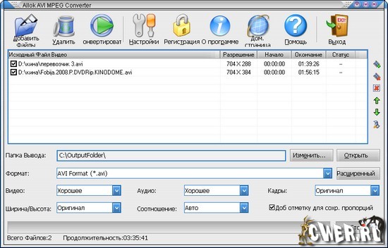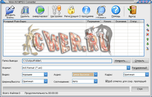 Allok AVI MPEG Converter - все что нужно для конвертирования видео среди форматов AVI, DivX, MPEG, VCD, SVCD, DVD, WMV и ASF. Быстрый встроенный MPEG-кодек позволит вам создавать файлы DVD-Video (VIDEO_TS, AUDIO_TS) и образы VCD/SVCD (*.bin,*.cue), так что вы легко сможете прожечь VCD/SVCD/DVD диски с помощью сторонних программ. Также имеется поддержка форматов 4:3 и 16:9, изменение качества выходного видео, все кодеки встроены в программу. Дружественный интерфейс поможет вам легко и быстро использовать программу.
