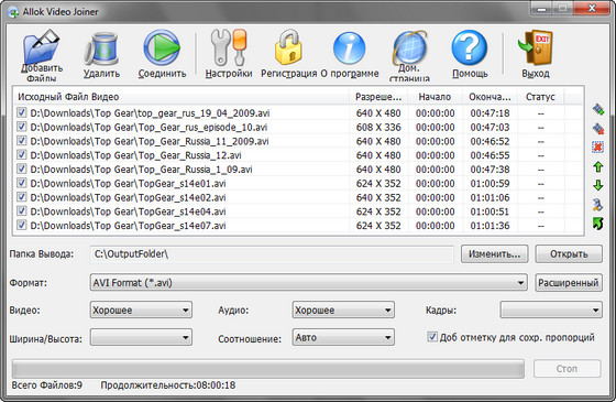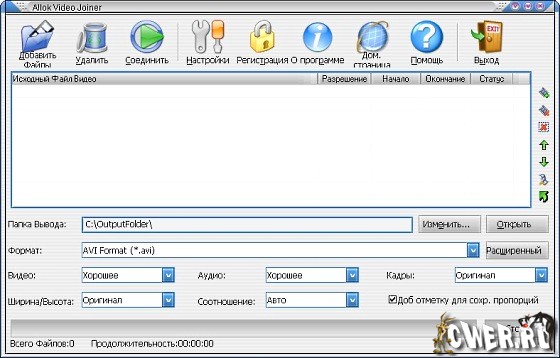 Allok Video Joiner - программа для создания одного большого медиа файла состоящего из AVI, Divx, XviD, MPEG I/II, VOB, DAT, ASF, WMV фрагментов. Позволяет соединять неограниченное количество видео файлов, сортировать последовательность фрагментов, добавлять к уже существующему проекту отрывки, сохранение проекта в AVI, MPEG, WMV, ASF форматах, встроенный проигрыватель поможет осуществить предварительный просмотр выбранного момента или просмотреть часть проекта. Программа проста в обращении, для получения конечного результата необходимо лишь несколько щелчков мышки, высокая скорость соединения без потери качества.