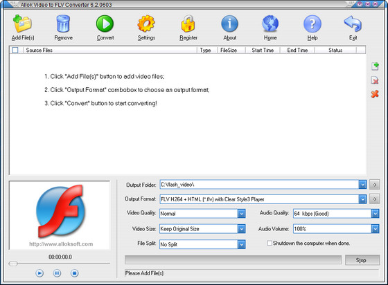 Allok Video to FLV Converter является мощным Flash Видео Кодером, предназначенным для того, чтобы преобразовывать любое видео в SWF и FLV видео форматы. Данная программа способна преобразовывать почти все видео форматы, к примеру, DivX, XviD, AVI, WMV, MPG, MPEG, MP4, M4V, FLV, 3GP, ASF, RM, RMVB, MOV, MOD, ASX, MKV, OGM, SVCD, VCD, VOB во FLASH видео (SWF, FLV) форматы.