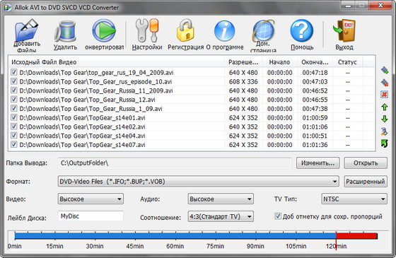 Allok AVI to DVD SVCD VCD Converter - мощный инструмент для конвертации AVI, DivX, XviD, MPEG, WMV видео файлов в DVD, SVCD, VCD форматы. Поддерживает PAL и NTSC преобразование; генерацию m2v и mpa файлов для DVD Author программ; AVI (DivX, XviD, MPEG4 ...), MPEG1, MPEG2, VCD (.DAT), ASF/WMV, RM/RMVB и других форматов; поддержка пакетного режима работы; возможность установки времени начала и конца файла, тем самым позволяет вырезать отдельные фрагменты; высокие скорость и качество; простой и удобный интерфейс.