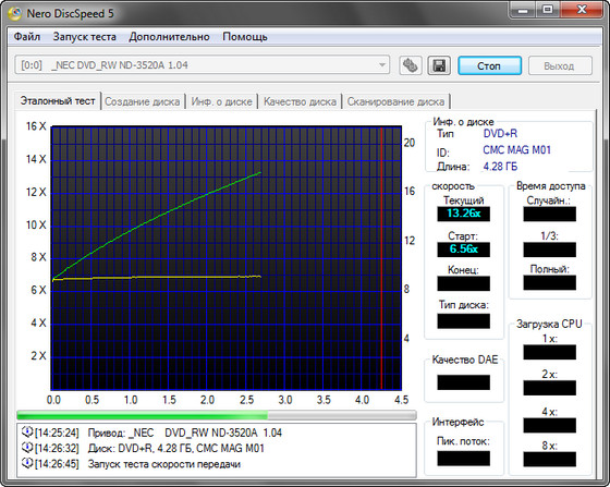 Пакет тестов для проверки качества CD/DVD-ROM приводов. Этот пакет тестов уже стал обязательным атрибутом для пользователей, записывающих CD/DVD диски в домашних условиях. Утилита Nero DiscSpeed (бывшая Nero CD-DVD Speed) позволяет протестировать как сам CD/DVD-ROM привод, так и качество чтения с записанного CD/DVD/BD и HD DVD диска. В пакет Nero DiscSpeed входят: тест скорости чтения CD/DVD/BD/HD DVD дисков, тест качества DAE, тест времени доступа/позицирования, тест загрузки процессора при различных скоростях чтения, тест пиковой скорости чтения, тест раскрутки/остановки диска в приводе, тест скорости открытия/закрытия лотка привода. Тесты можно пройти по одному или выборочно.
