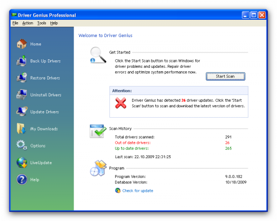 Driver Genius Professional - программа для управления драйверами (создания резервных копий, восстановления поврежденных версий, обновления и удаления ненужных), имеющая также некоторые возможности для диагностики аппаратного обеспечения. Driver Genius позволяет в автоматическом режиме найти необходимые драйверы для всех устройств, используя данные об установленных в систему устройствах. Поддерживается работа с более чем 30 тысячами различных материнских плат, видеокарт, звуковых и сетевых карт, модемов, мониторов, клавиатур, мышей, видеокамер и т.д. База программы постоянно обновляется.