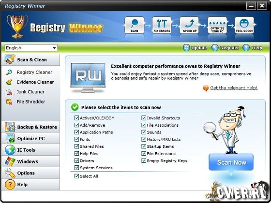 Registry Winner – программа для улучшения работы компьютера, которая находит ошибки, оптимизирует систему и ускоряет ее. Вы можете столкнуться с различными проблемами, которые постепенно появляются с использованием компьютера, например, замедление, зависание, «голубой экран смерти», постоянные сообщения об ошибках и т.д. Registry Winner использует только самые продвинутые технологии для сканирования ваших жестких дисков и дает вам наиболее полную диагностику всего за несколько секунд. Как только проблемы обнаружены приложением, Registry Winner предложит вам профессиональное и высокоэффективное решение для вашего компьютера.