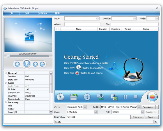 Joboshare DVD Audio Ripper - является мощным DVD Audio Extractor и DVD в MP3 конвертором, который может извлечь аудио из фильмов DVD, преобразование классических диалогов и конвертирование DVD фильмов аудио в MP3, WMA, WAV, AAC, AC3, OGG, RA и SUN AU форматы с отличным качеством звука.