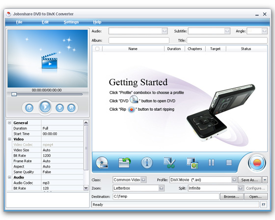 Joboshare DVD to DivX Converter - является мощным и простым в использовании DVD в DivX, DVD в XviD конвертором, который помогает вам преобразовывать и конвертировать DVD в DivX, XviD, AVI видео форматы быстро и легко.